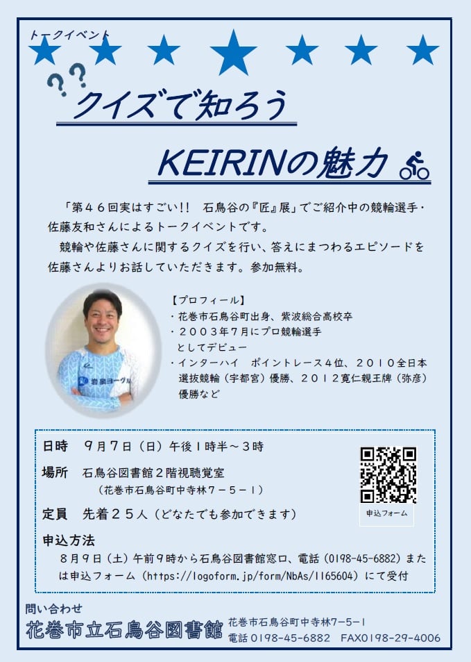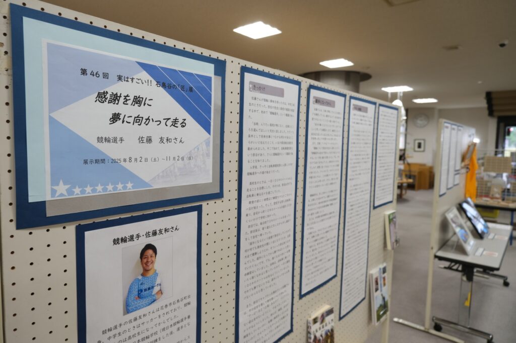 現在、石鳥谷図書館にて、第46回 実はすごい!! 石鳥谷の「匠」展として、競輪選手 佐藤友和さんの展示が行われています。